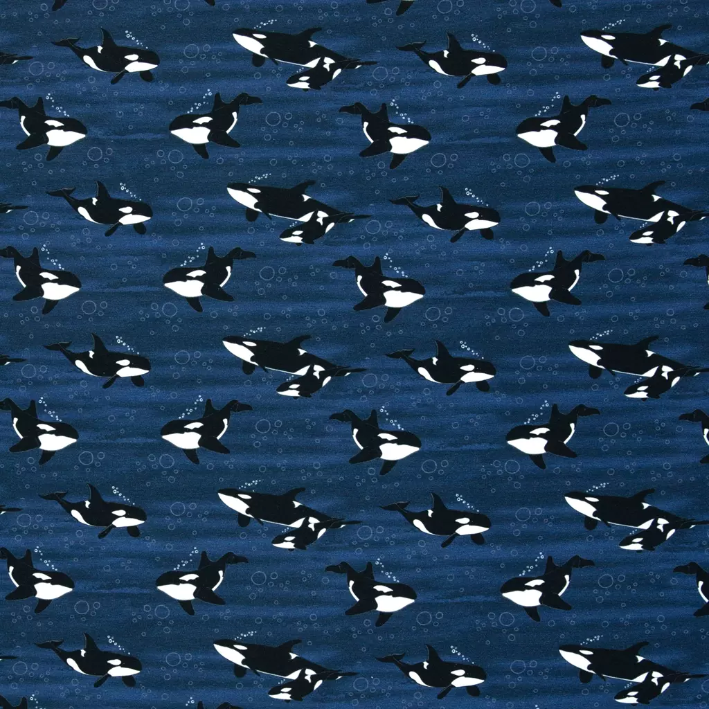 Mit diesem Jersey holst du dir die majestätischen Orcas direkt auf den Nähtisch. Das Design zeigt die faszinierenden Meeressäuger in dunklem Blau, elegant und detailverliebt illustriert – perfekt für maritime Nähprojekte.